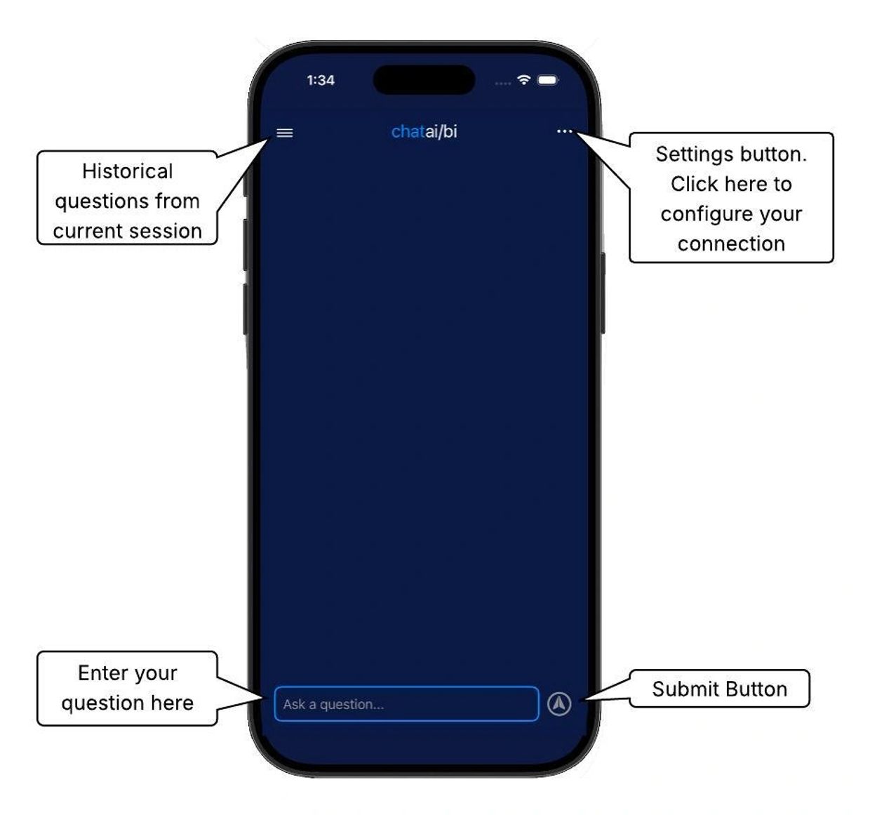 This is the home page for chatai/bi. On the top left, you will find a menu for suggested and historical questions from the current session. On the top right you will find the settings link. You will need to setup your connection to Snowflake here. And on the bottom you will find common chat components.